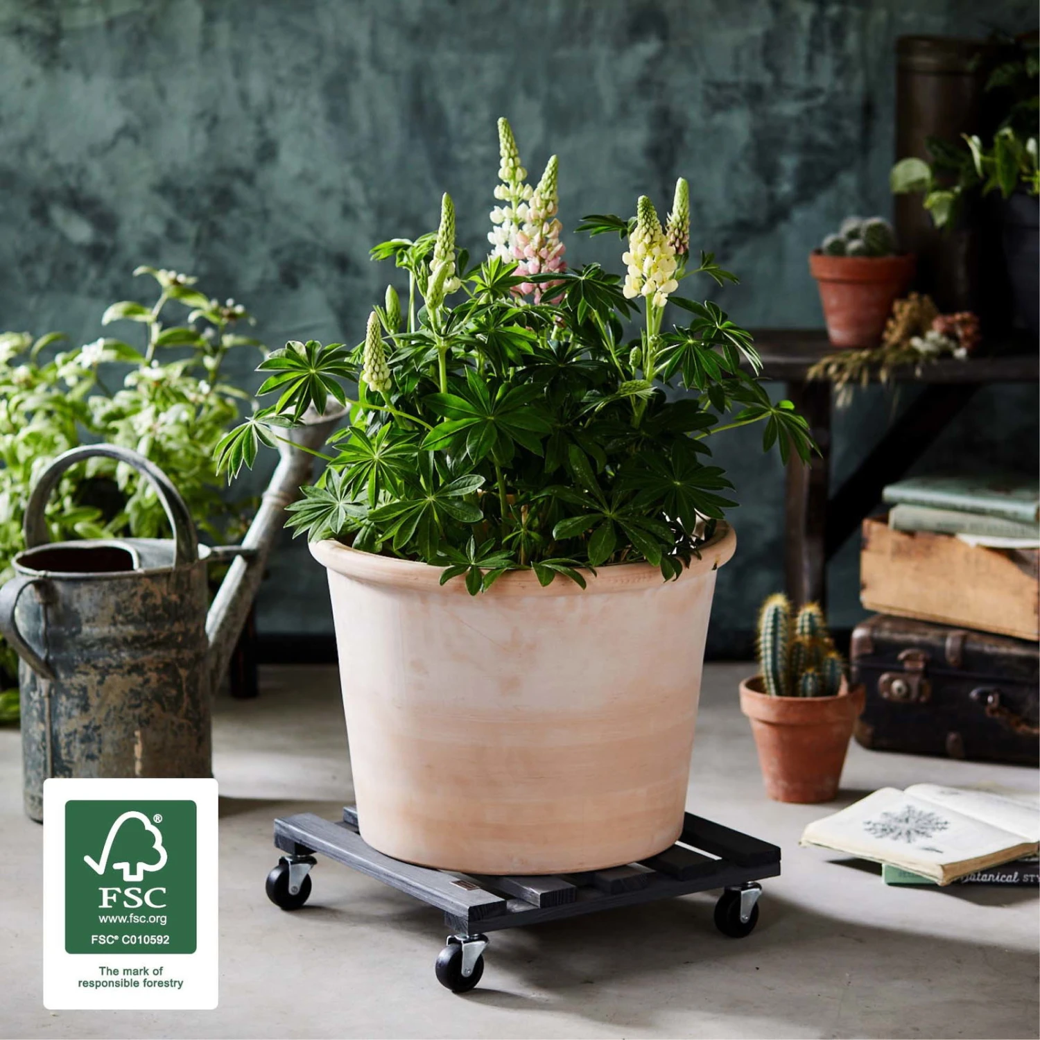 Belastungen von bis zu 120 Kilogramm sind für diesen Pflanzenroller kein Problem. Der Multi Roller in der Farbe Anthrazit ist stabil gebaut und verfügt über eine Tragfläche aus FSC®-zertifiziertem Kiefernholz. Dieser Pflanzenroller ist leicht zu manövrieren, sieht ansprechend aus und hilft Ihnen, Ihre Innen- oder Außenbegrünung flexibel zu gestalten.